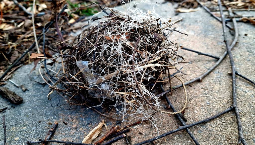 Intended to promote the growth of a resource-intense “crop” (a failed experiment), it was now in the environment (despite the touted “biodegradable” claim on the packaging) and rediscovered by my feathery neighbor. Was this bird upcycling? Was the bird participating in a circular economy? An attempt to “right my wrong”? Although my intentions to grow grass or use a straw mat with questionable biodegradability were not nefarious, my actions had consequences. Were those consequences “good” or “bad”? I think it was certainly less than ideal and there is a sadness in seeing nature innocently reduced to using human trash as building materials.