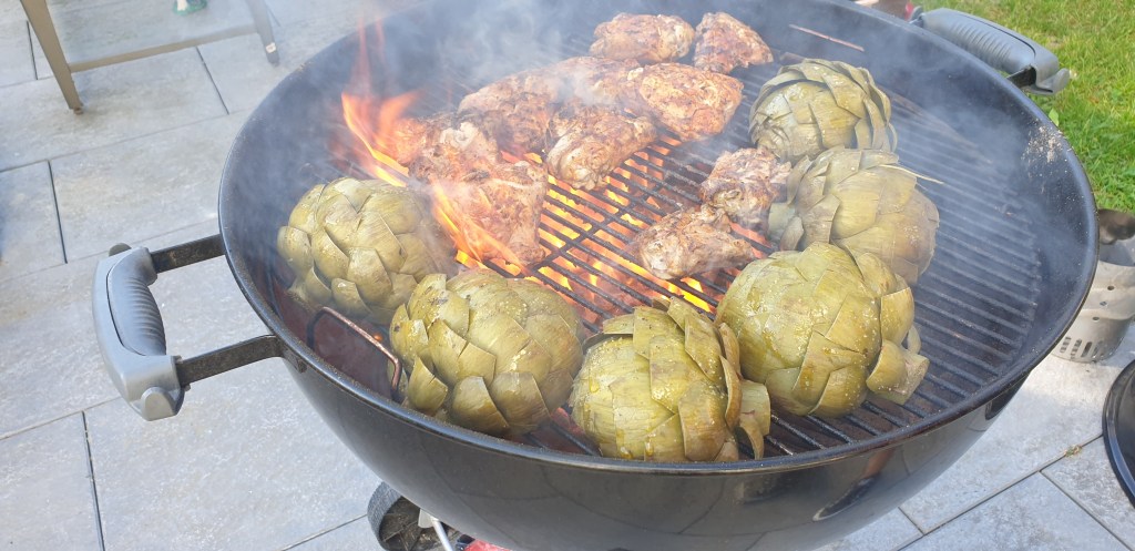 The foods, themselves…well, the lockdown spanned late winter to late spring, so they were everything from the stew I mentioned to grilling artichokes and chicken, denoting a seasonal link to each meal. I do recall niçoise and wedge salads and lots of fresh asparagus. This brings me to the spargelzeit that overlapped the stay-at-home orders. Spargel is the German word for asparagus and they take their asparagus harvest very seriously there. It was the one year I know we didn’t go out for a meal to have the traditional white asparagus with hollandaise sauce and boiled potatoes (it’s a very pale plate of food, but thankfully not the only option you’ll find on the menu). Instead, we had to buy them at the store and prepare them ourselves. I was too afraid to figure out the machine that peels the spargel for you, so I sat there peeling mine by hand. At any rate, we prefer the green asparagus anyhow, so that’s what we mostly consumed. It was still, nevertheless, a small disruption to the culture of Germany in springtime.