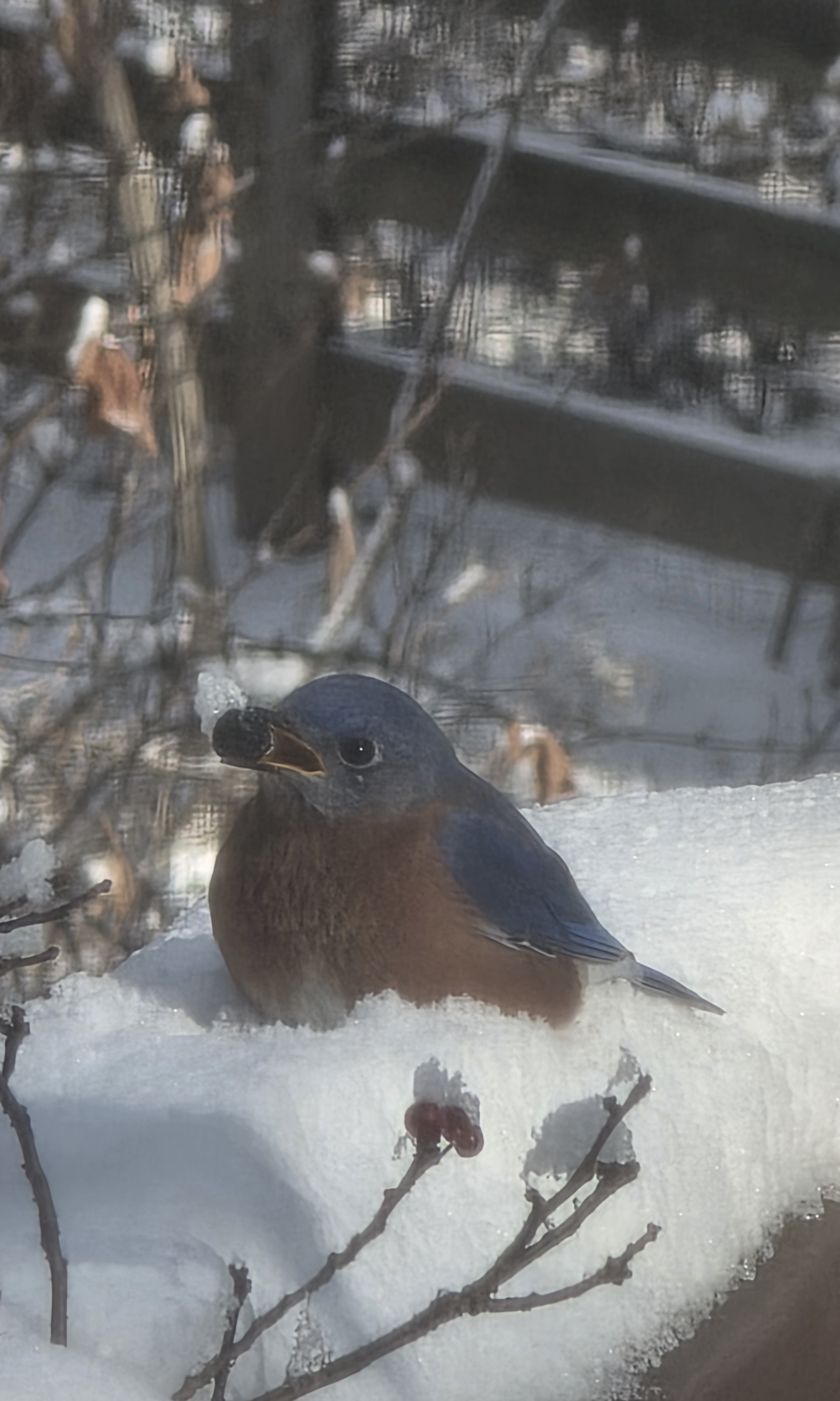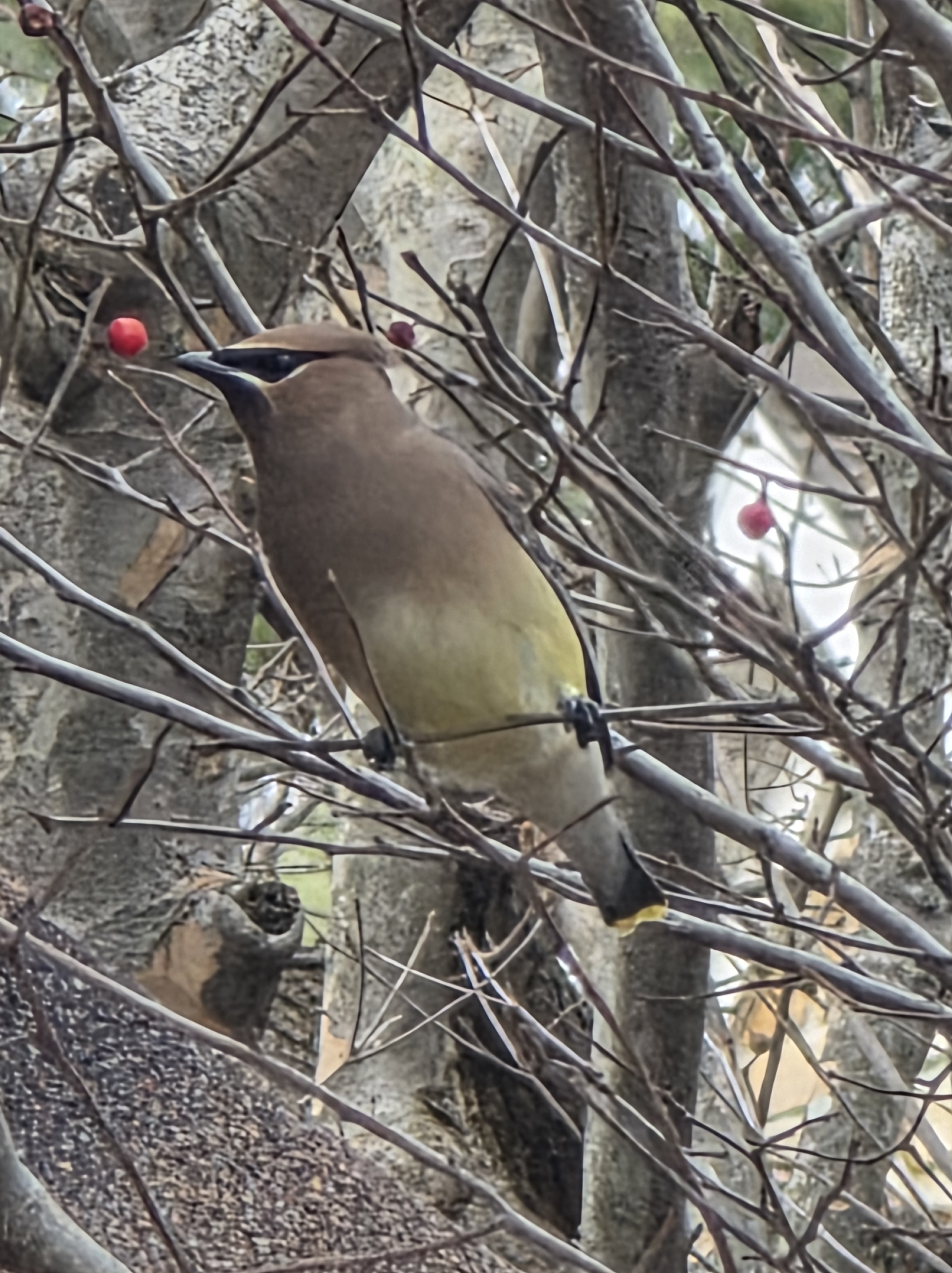 I’ll go first. The trees I can identify in my garden are: pignut hickory, tulip poplar, birch, dogwood, fig, ornamental plum, and winterberry (a favourite of the birds that stick around or travel south – as seen below).