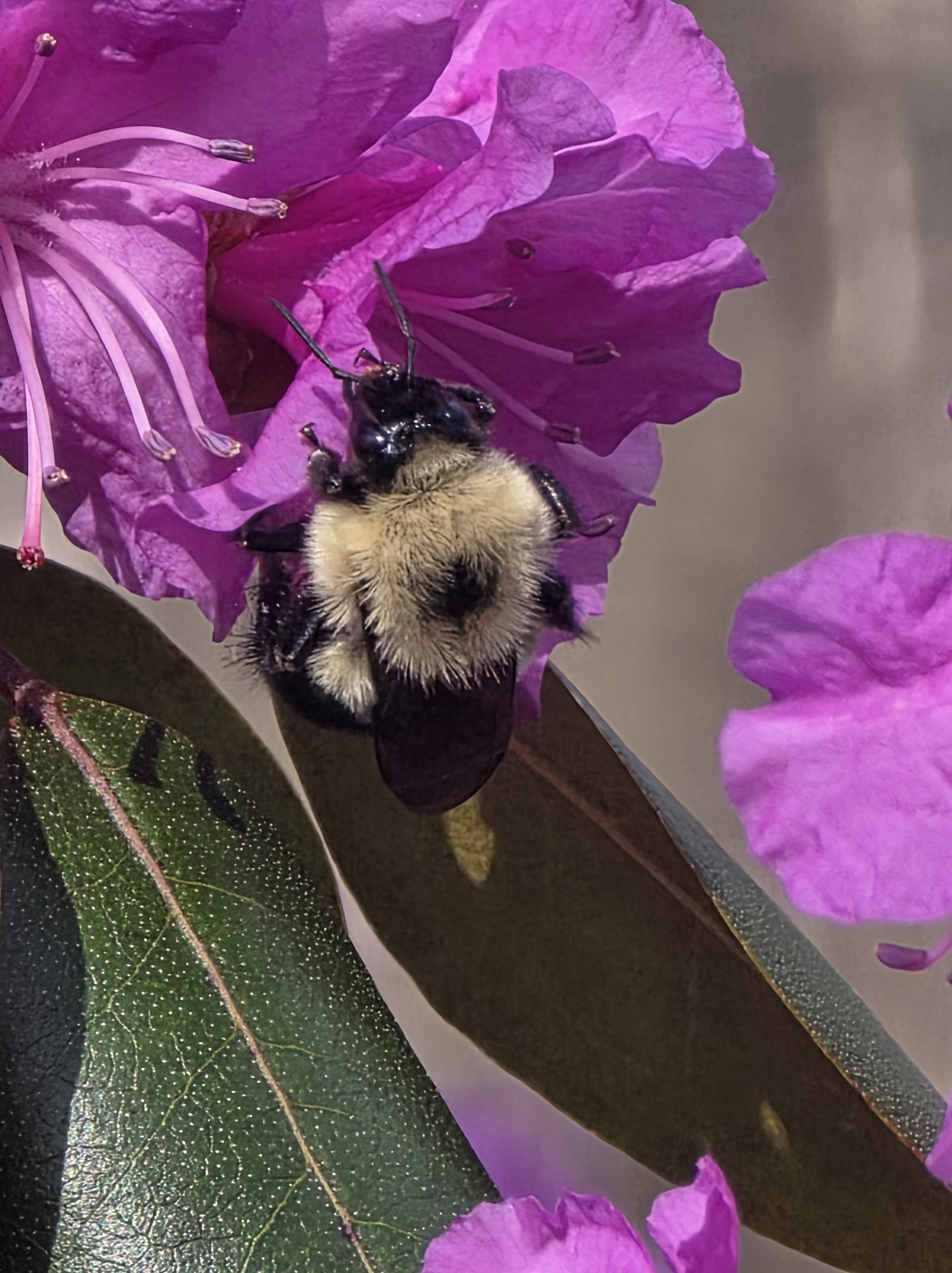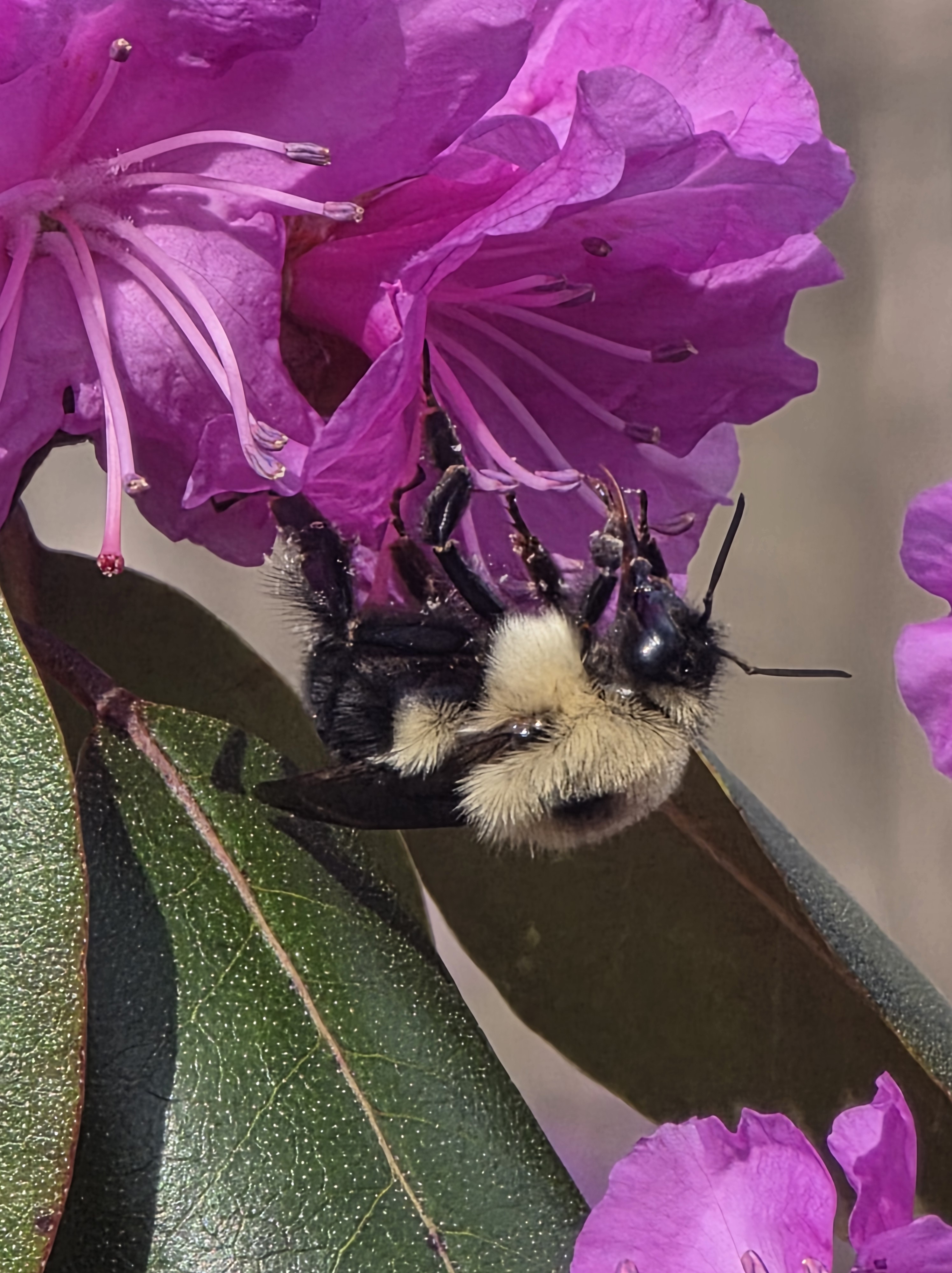 Some bumble bee facts: They do not have a barbed stinger like honey bees, so they will not die after stinging. That said, they are docile critters and only sting when threatened. Also, only the females have a stinger, like the paper wasp.